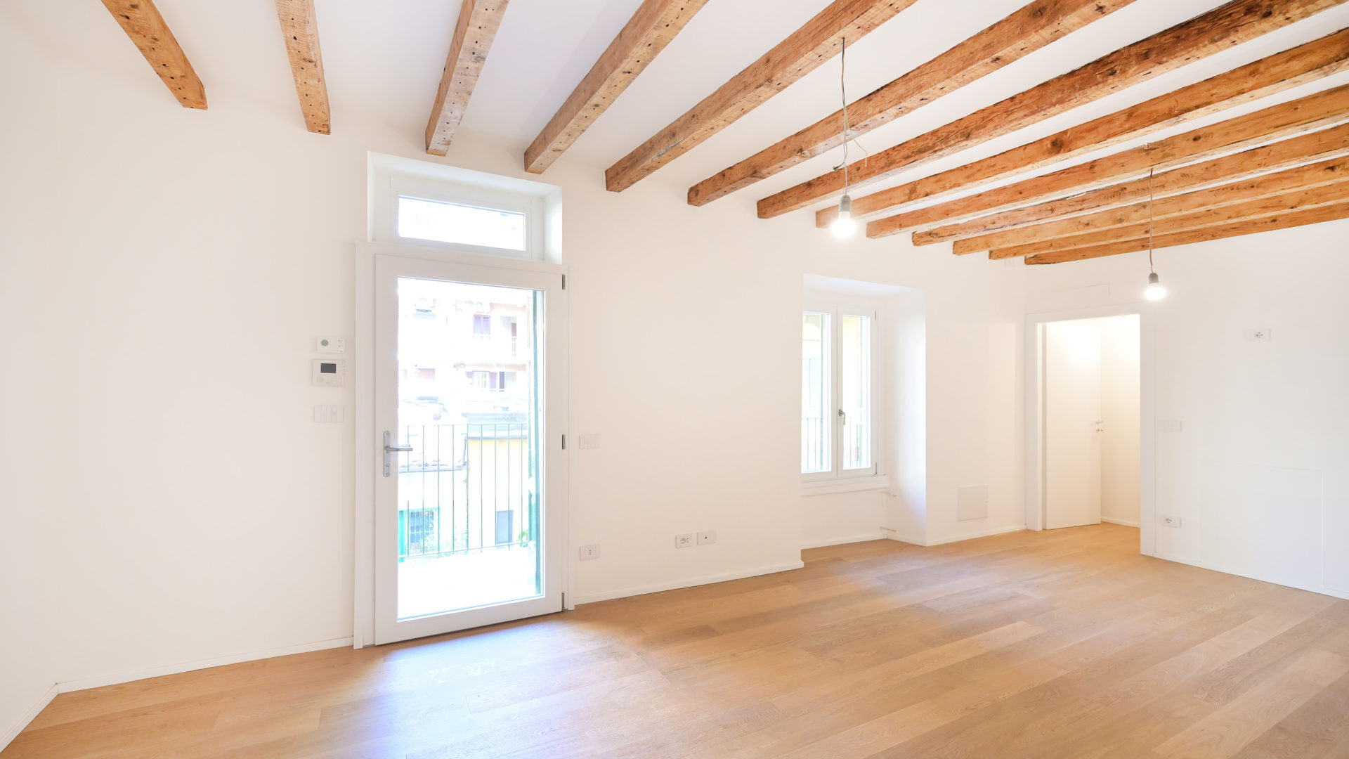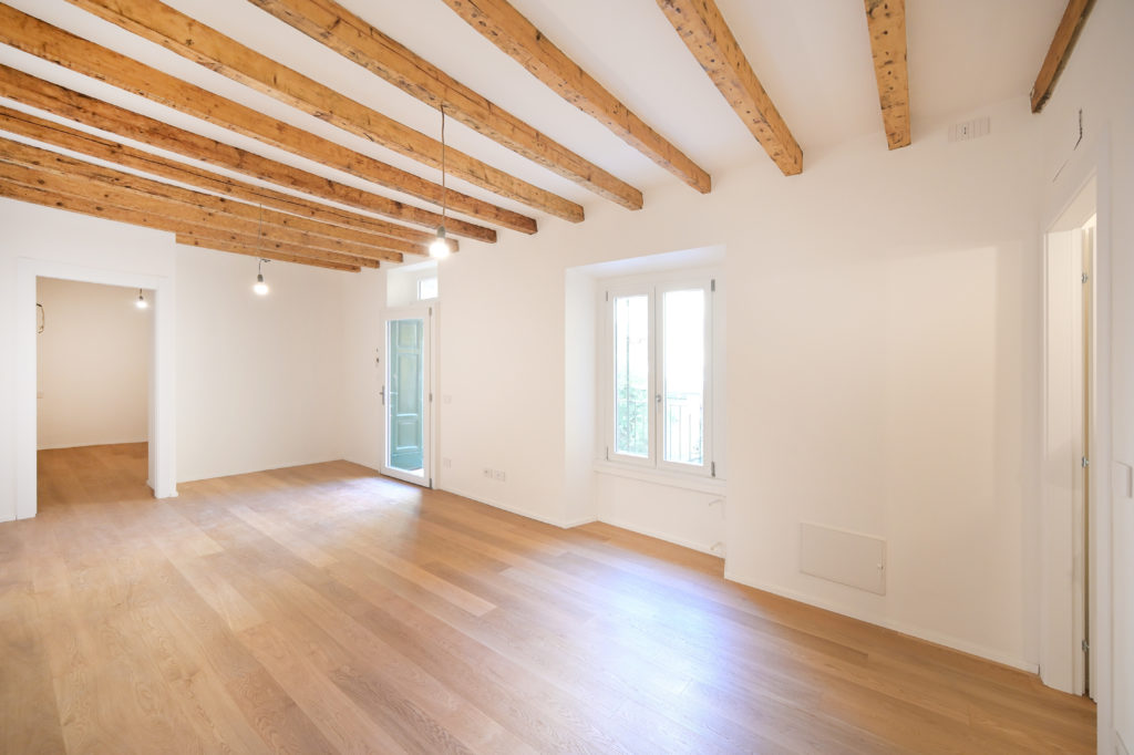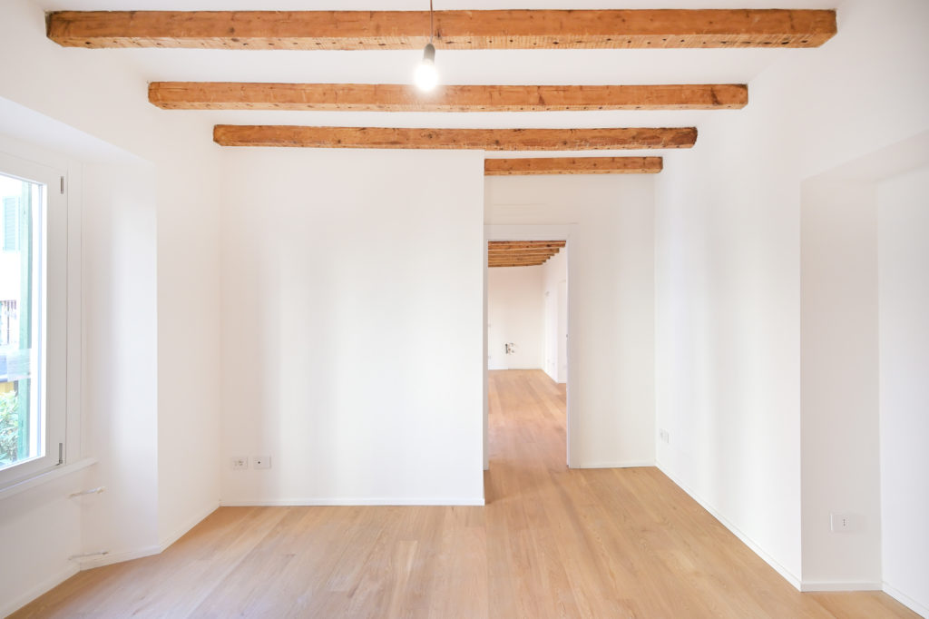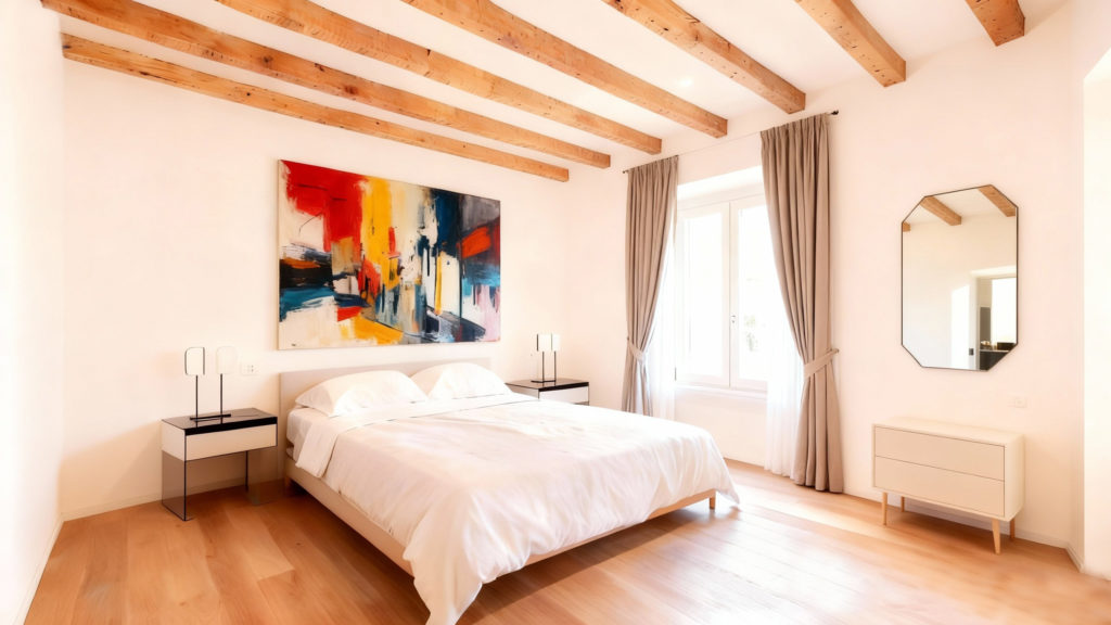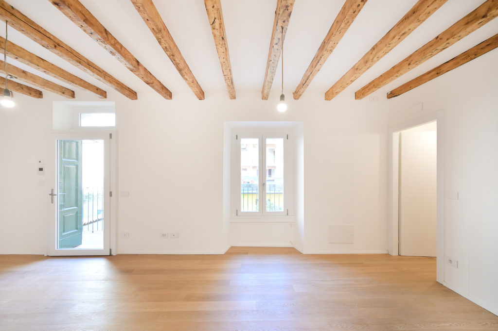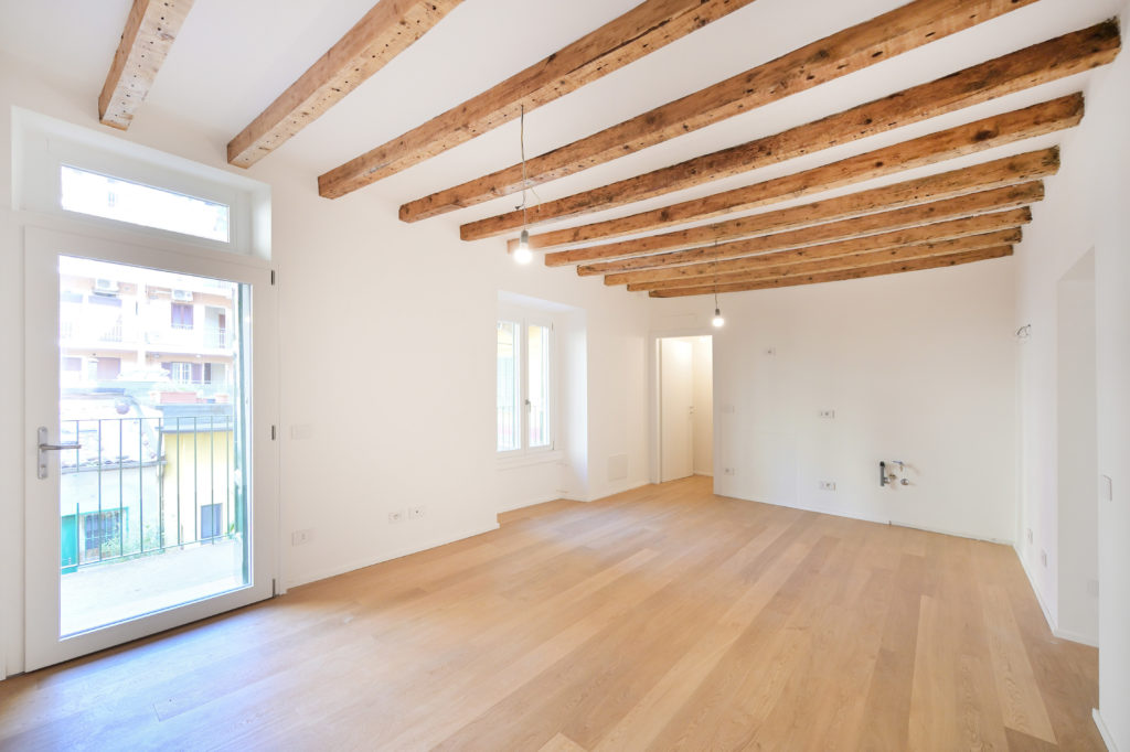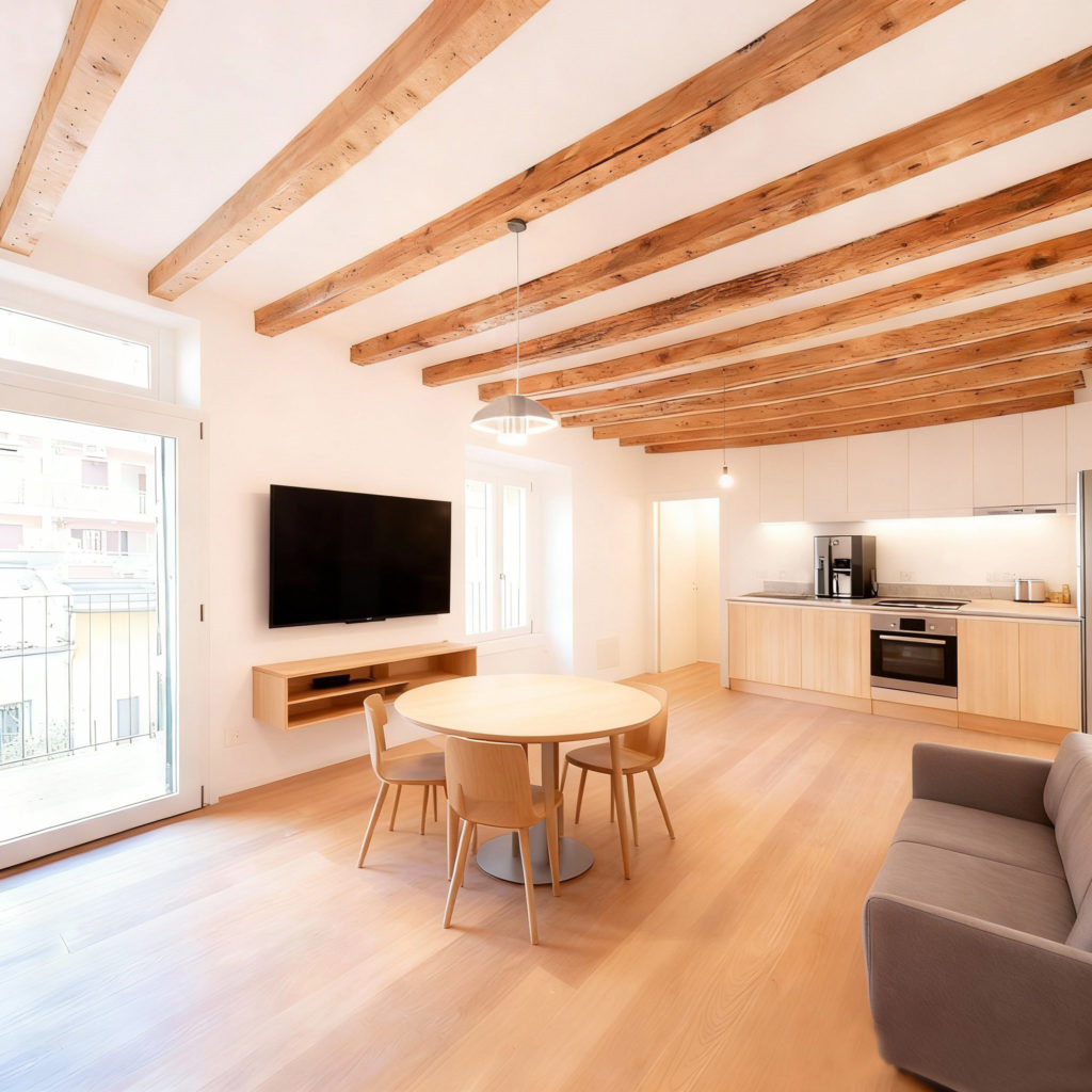 All’interno, la ristrutturazione punta sulla massimizzazione spaziale: la distribuzione fluida annulla le gerarchie tradizionali, collegando il living e la zona notte attraverso l’uso sapiente di materiali naturali e texture materiche. Le travi lignee a vista, riportate allo stato originale, dialogano con innesti minimalisti e soluzioni su misura che ottimizzano i volumi ridotti. Il risultato è un’estetica rigorosa ma calda, dove la luce naturale filtra dalle finestre d’epoca, creando un contrasto armonico tra il passato operaio dell’edificio e la nuova identità residenziale di alto profilo.
